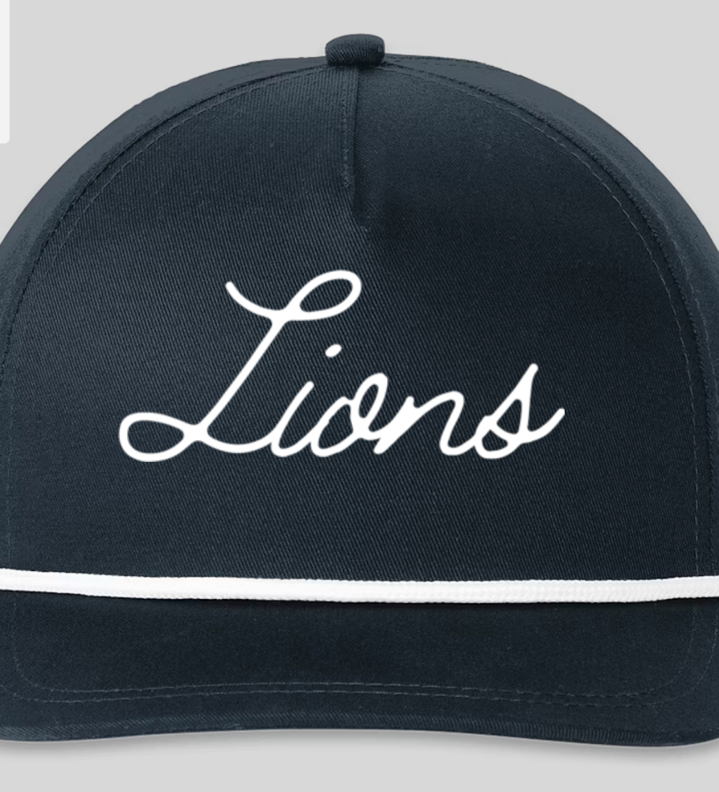 Navy cap with Lions script lettering embroidered in white on the front, over the visor with a white rope accent. On the back, GHMV letters are in a smaller serif typeface above the closure. One size fits all.